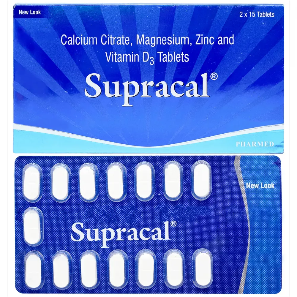 Supracal Tablet contains four nutritional supplements: calcium citrate, vitamin D3, zinc sulfate, and magnesium sulfate. Together, they promote the body's proper growth and development. Furthermore, it strengthens the bones.