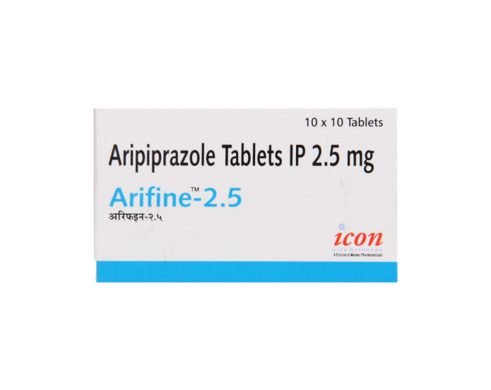 Arifine 2.5 Tablet is an antipsychotic medication. It is used to treat mania and schizophrenia, two mental illnesses that can cause hallucinations or delusions and negatively impact a person's capacity for thought and behavior. Bipolar disorders and depression can also be treated with it.