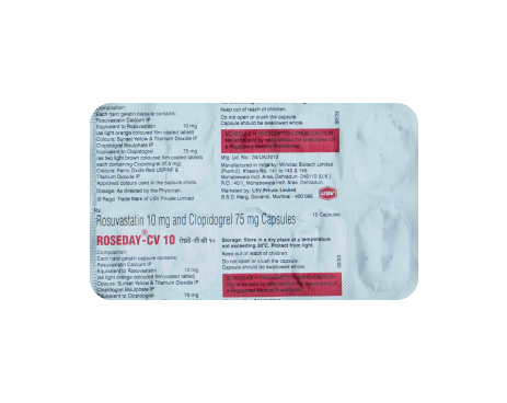 Roseday-CV 10 Capsule is a mixture of two medications that helps to avoid heart attacks, angina, and strokes. This drug lowers "bad" cholesterol (LDL) and triglyceride (fat) levels. Furthermore, it reduces the production of dangerous blood clots.