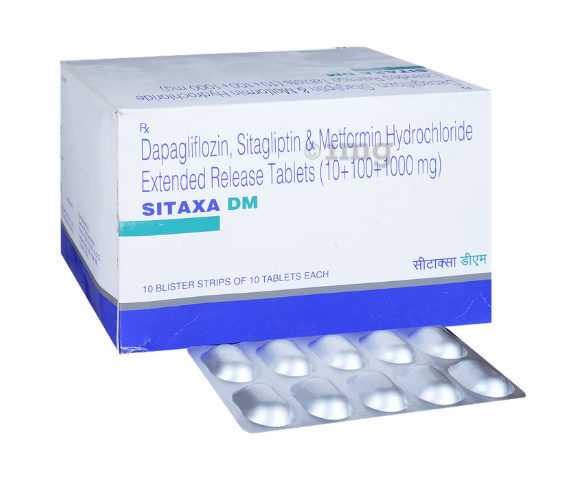 Sitaxa DM 10mg/1000mg/100mg Tablet ER is a medication used to manage high blood sugar levels. It works by eliminating excess glucose through urine, helping to regulate blood sugar effectively.