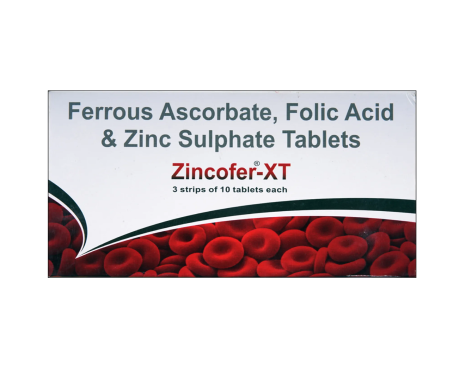Zincofer XT Tablet is a combination medicine of the 'hematinic' family that is primarily used to prevent and cure low levels of folic acid, zinc, and iron in the blood during various health situations (e.g., anaemia, pregnancy, a poor diet, surgical recovery). Anaemia is a health condition in which the body has less red blood ce...